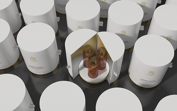 創(chuàng)意思路:每一個(gè)女性都是精心雕刻的藝術(shù)品,捧在手心怕摔,含在嘴里怕化。對(duì)此我們?cè)跒樵?shī)丹雅格設(shè)計(jì)瓶型時(shí),以“呵護(hù)”為核心理念,以雙重保護(hù)為主,在套盒外觀上,用地拖舞臺(tái)承放產(chǎn)品,外托盒上,以打開(kāi)式,讓產(chǎn)品從套盒中脫穎而出,綻放產(chǎn)品本身光彩。在單品上,以橢圓形的“蛋”形,將產(chǎn)品注入瓶子中,詮釋產(chǎn)品的珍貴與獨(dú)特。
